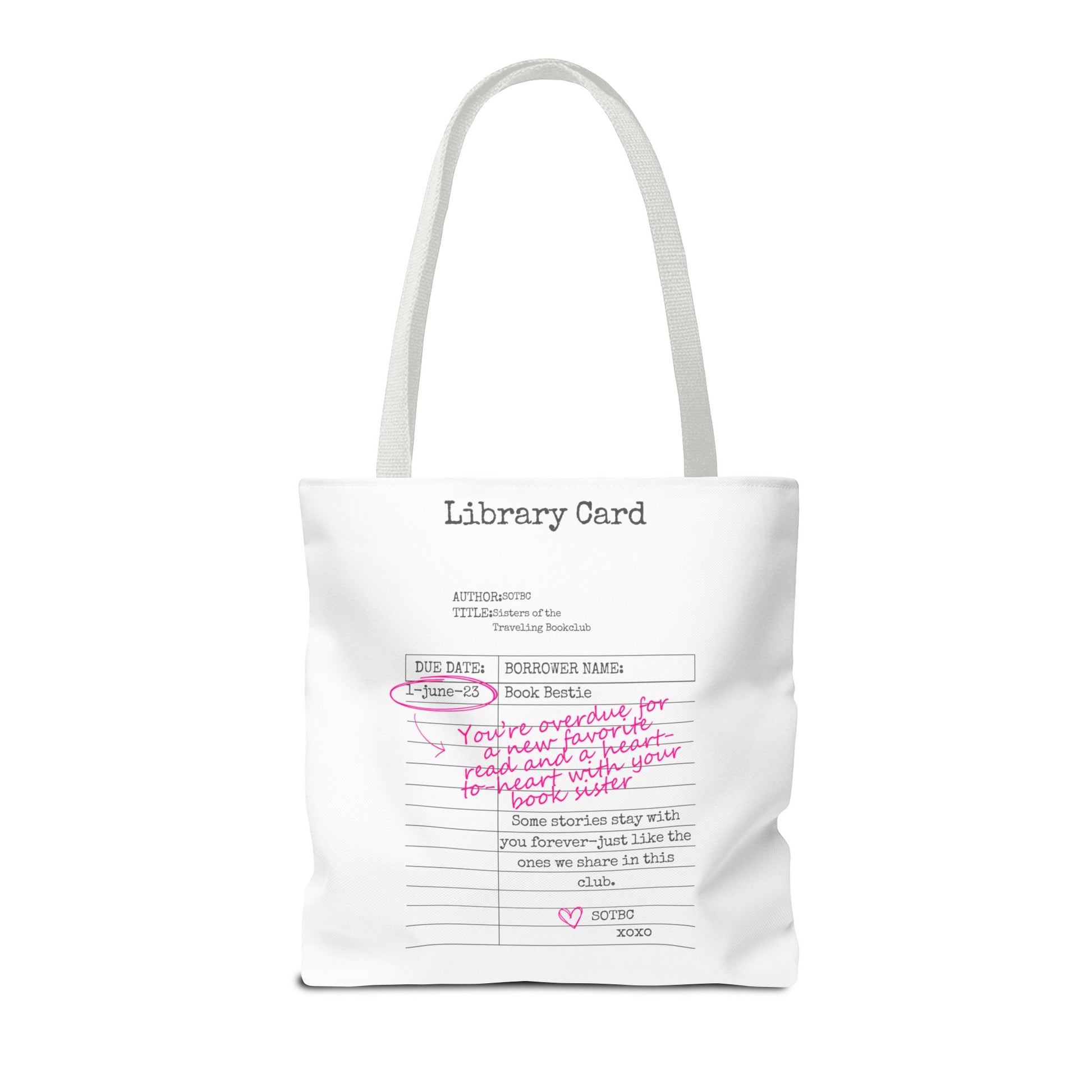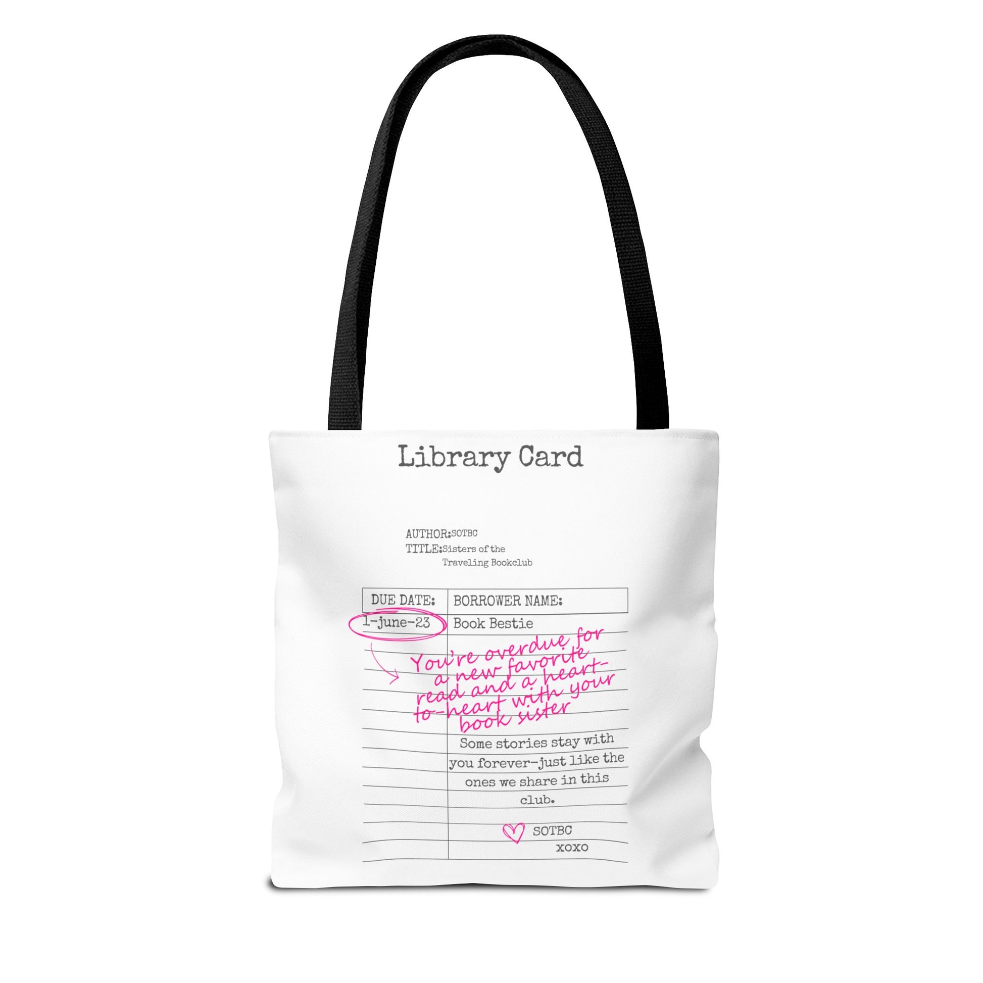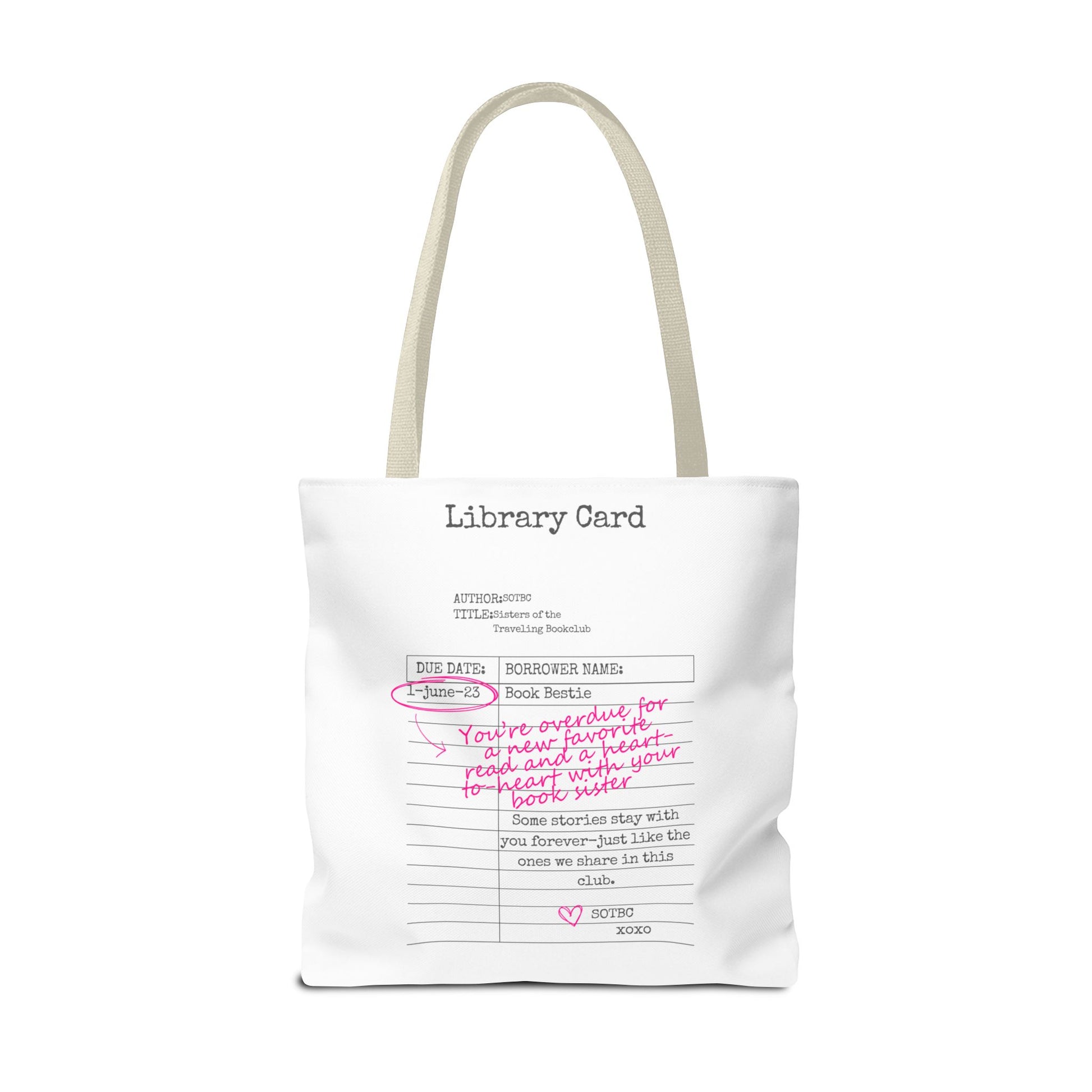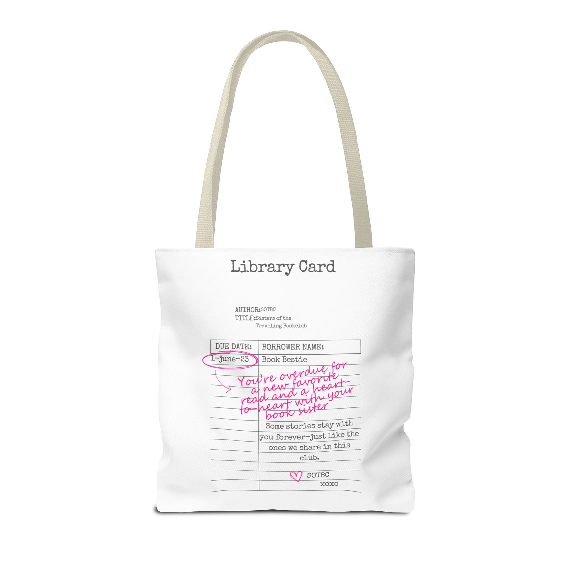 Carry your stories, essentials, and a little sisterhood wherever you go with the SOTBC Library Card Tote. Designed to blend everyday function with bookish style, this custom-printed tote is perfect for book hauls, library runs, errands, and daily life on the go.