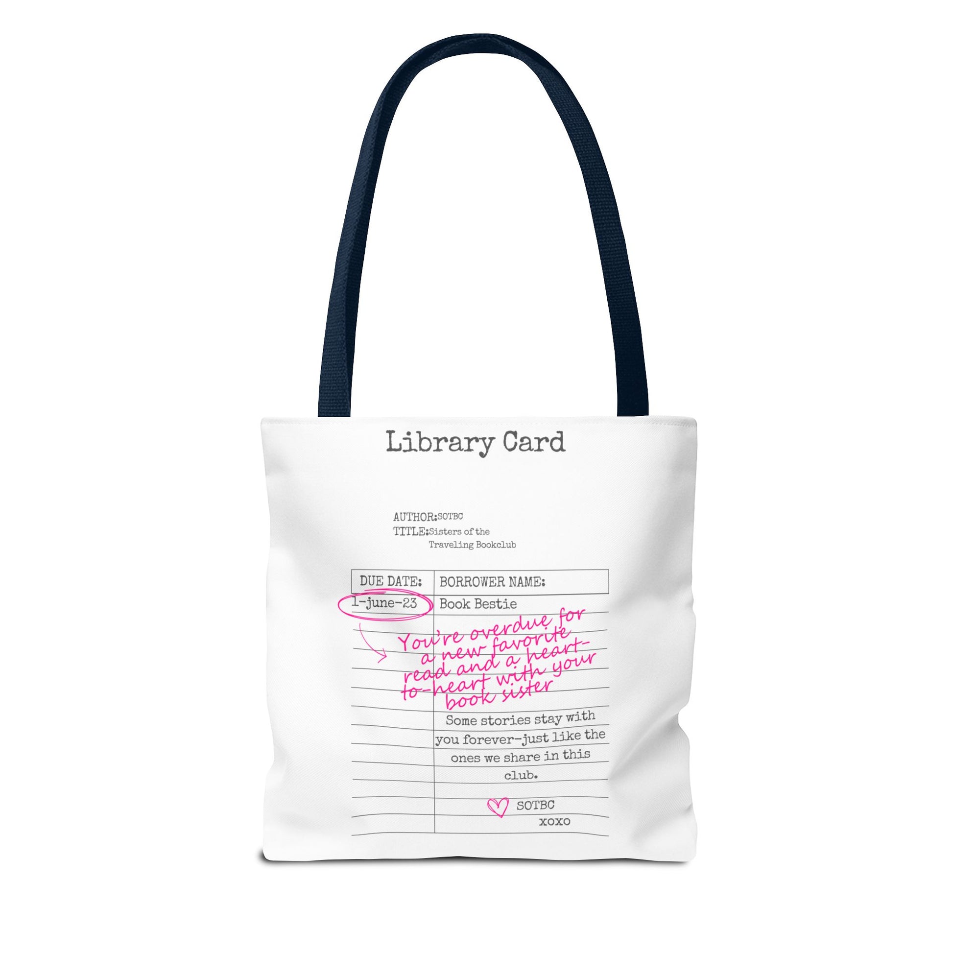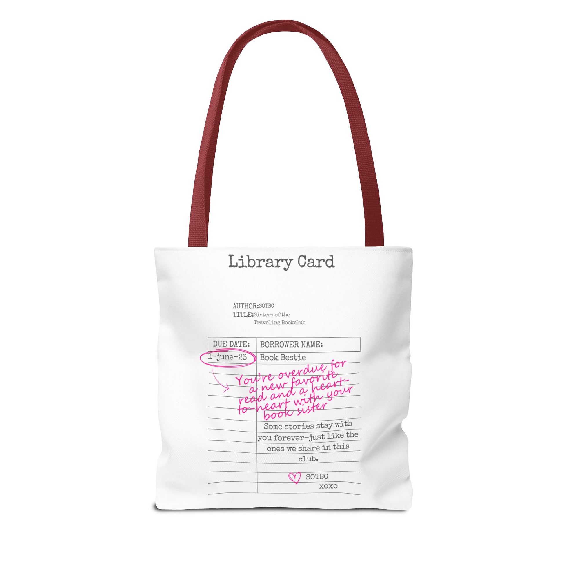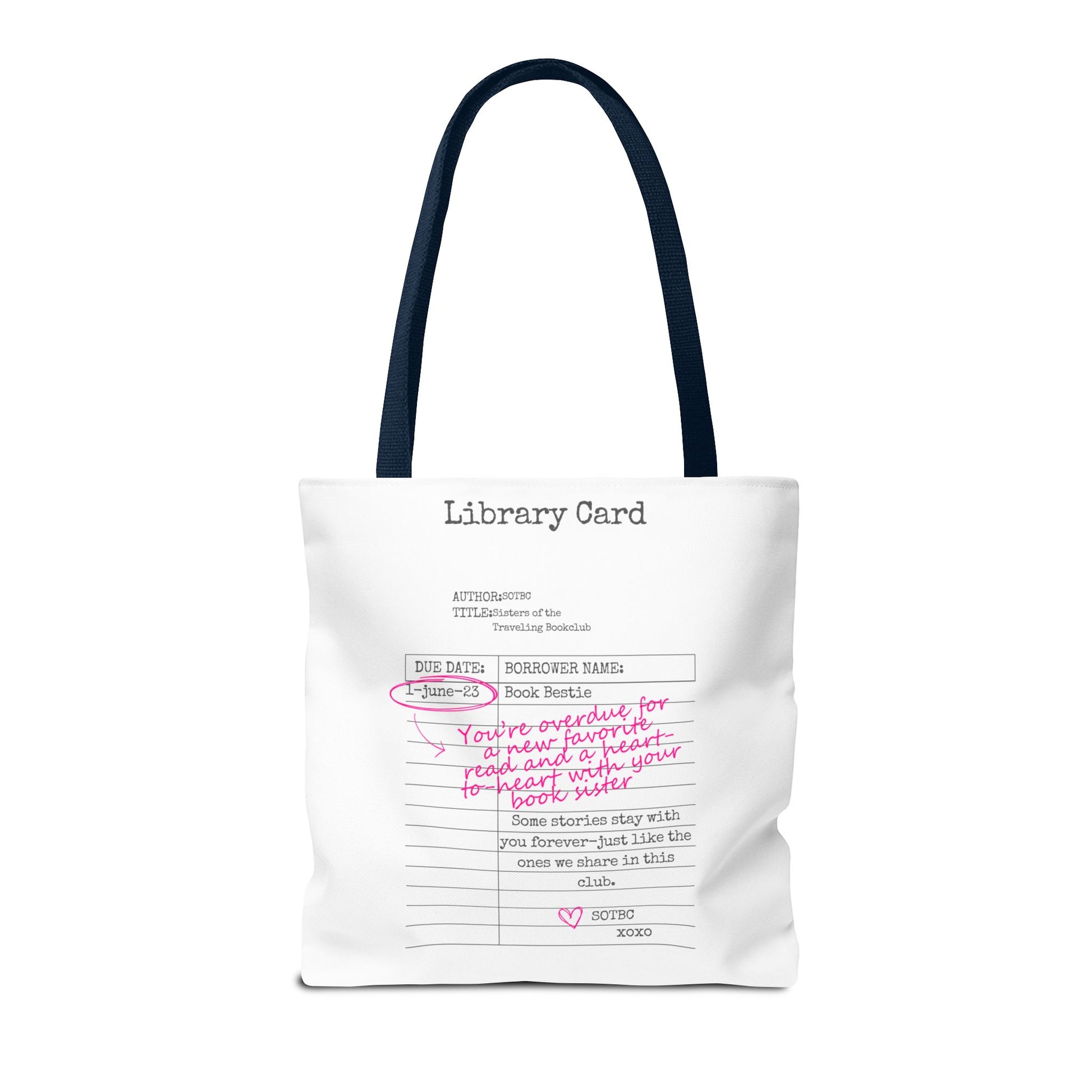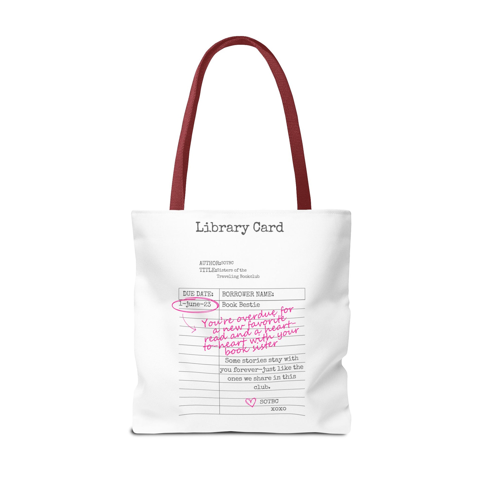 Carry your stories, essentials, and a little sisterhood wherever you go with the SOTBC Library Card Tote. Designed to blend everyday function with bookish style, this custom-printed tote is perfect for book hauls, library runs, errands, and daily life on the go.